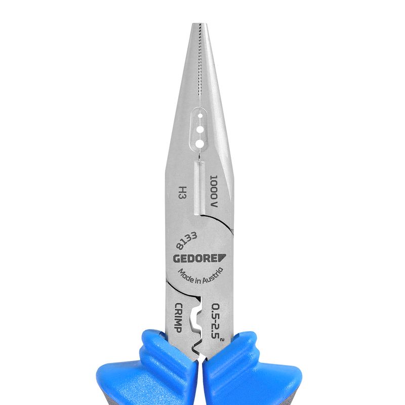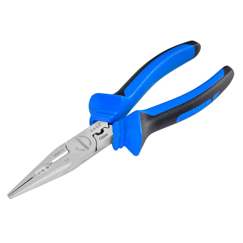 O Alicate Multifuncional 7'' Isolado Gedore possui bico semirredondo, reto, ponta fina com dentes finos e em paralelo, permitindo puxar, segurar, cortar, desencapar, amassar e crimpar fios e cabos.