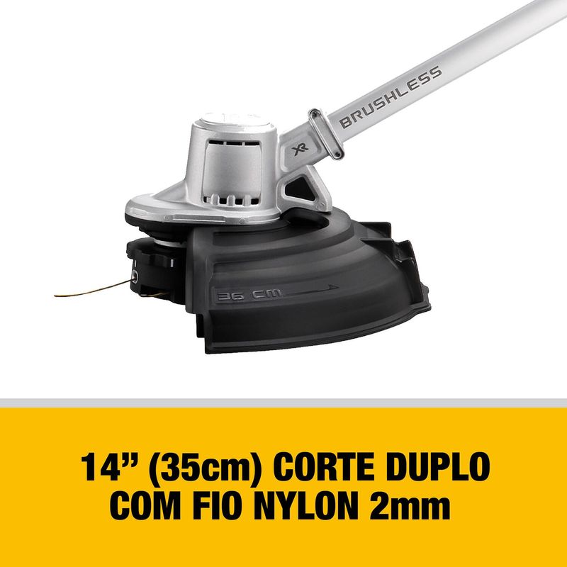 Conta com seletor de velocidade variável para controle de potência e tempo de uso, além de carretel Quickload™ com fio de nylon de 2 mm nas cores amarelo e preto, ideal para eliminar o crescimento excessivo de grama e ervas daninhas.