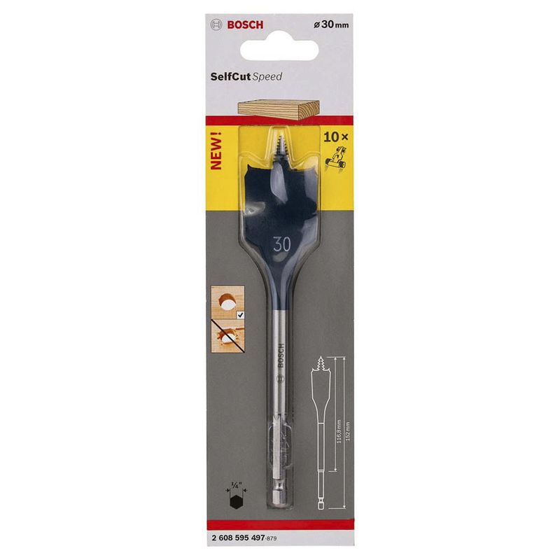 A Broca Chata para Madeira 30 x 152mm Self Cut Speed Bosch é ideal para perfuração em madeira, madeira dura, madeira maciça, madeira macia e placas de aglomerado de madeira.