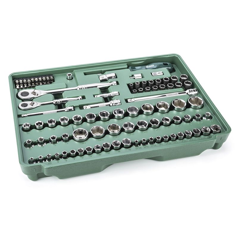 A Caixa de Ferramentas 3 Gavetas com 213 Peças Sata possui design compacto e berços sob medida que proporcionam uma organização eficiente e flexível.