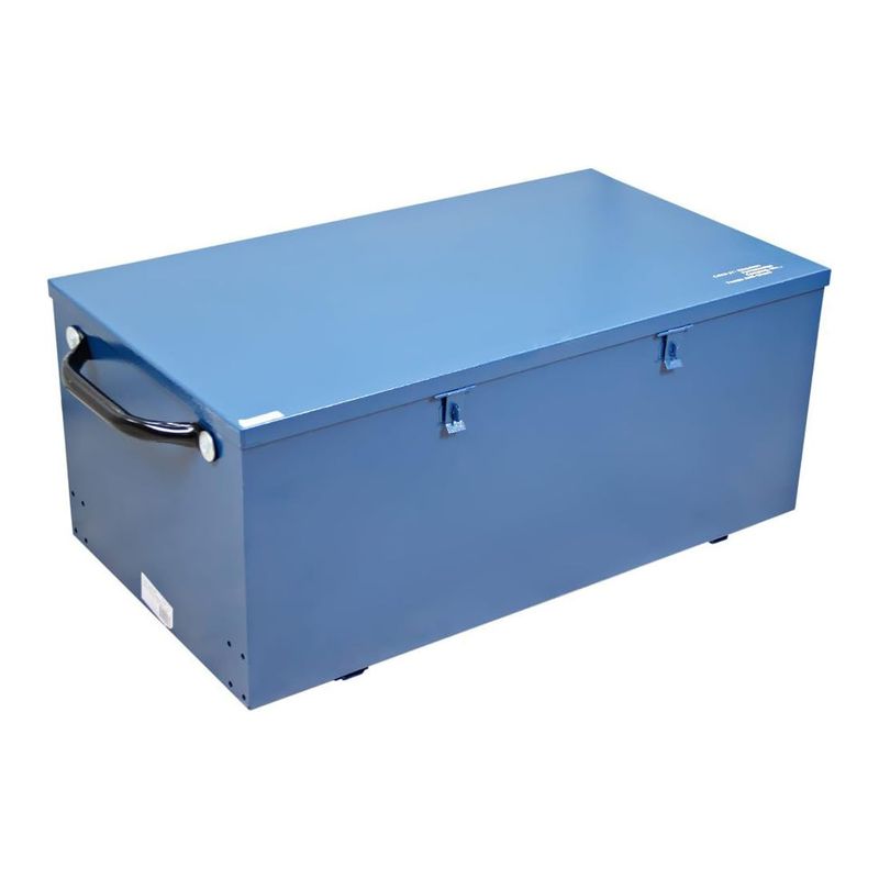 Possui dois suportes para cadeado, garantindo segurança no armazenamento, e duas alças laterais que facilitam o transporte.