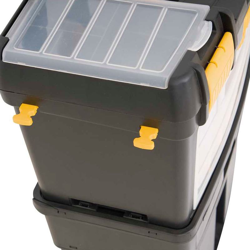 Conta com tampa com estrutura reforçada com 2 compartimentos, bandeja para ferramentas removível, bandeja frontal destacável com múltiplas divisórias, alça dobrável, rodas para transporte e travas reforçadas, além de ganchos na lateral superior para enrolar extensão elétrica de cabo fino.