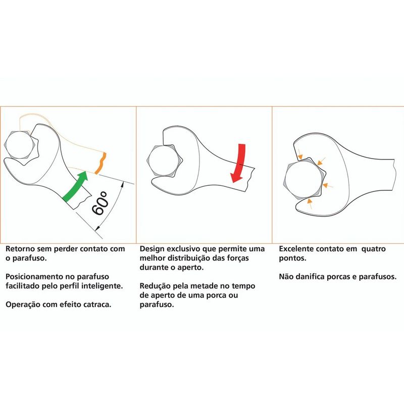Sua forma construtiva permite apertar parafusos e porcas sem precisar tirar a chave para encaixá-la a cada movimento, o mesmo acontece se inverter a chave para afrouxar.