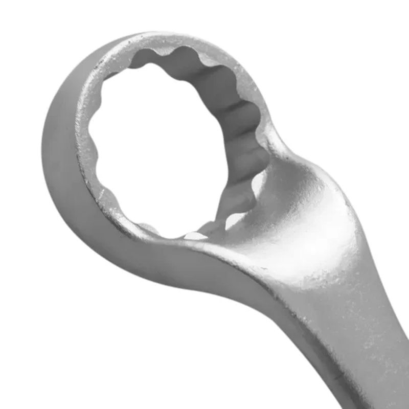 Forjada em aço cromo-vanádio, confere maior resistência e durabilidade. Com acabamento cromado fosco.