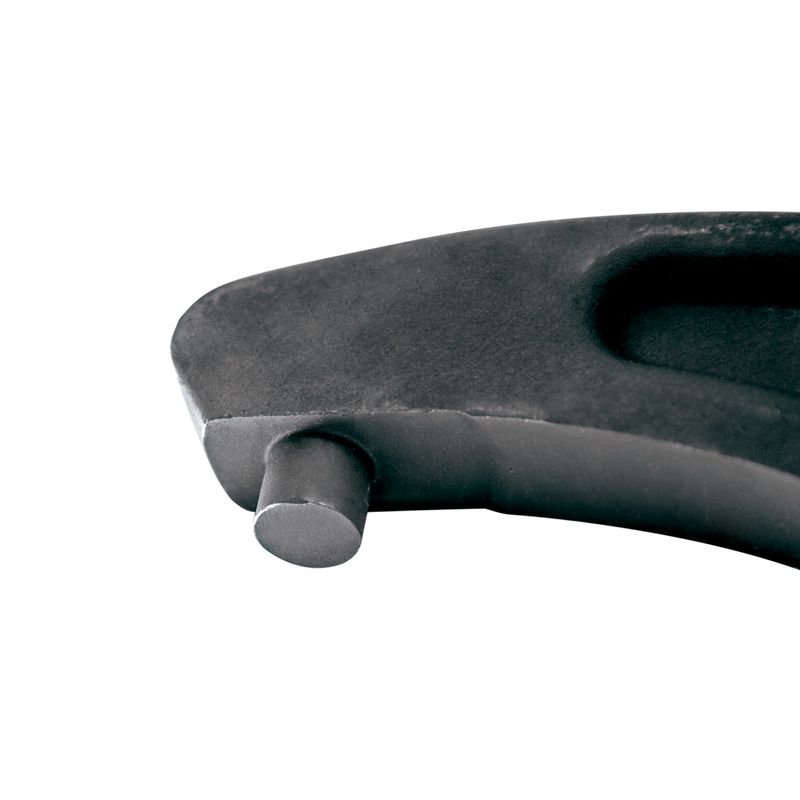 Possui uma extremidade em formato de gancho com pino, que é projetada para se encaixar em torno do parafuso ou da porca.