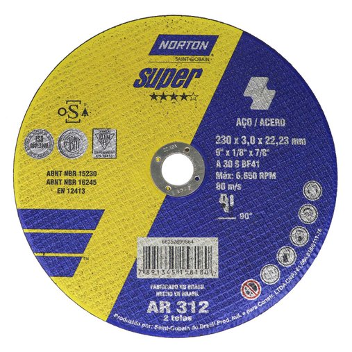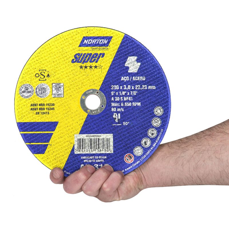 O Disco de Corte 9'' x 3mm x 22mm AR312 Norton é ideal para cortes precisos e rápidos de chapas e perfis de aço carbono e aço inox, em montagens e manutenção industrial, e manutenção pesada em diversas indústrias.