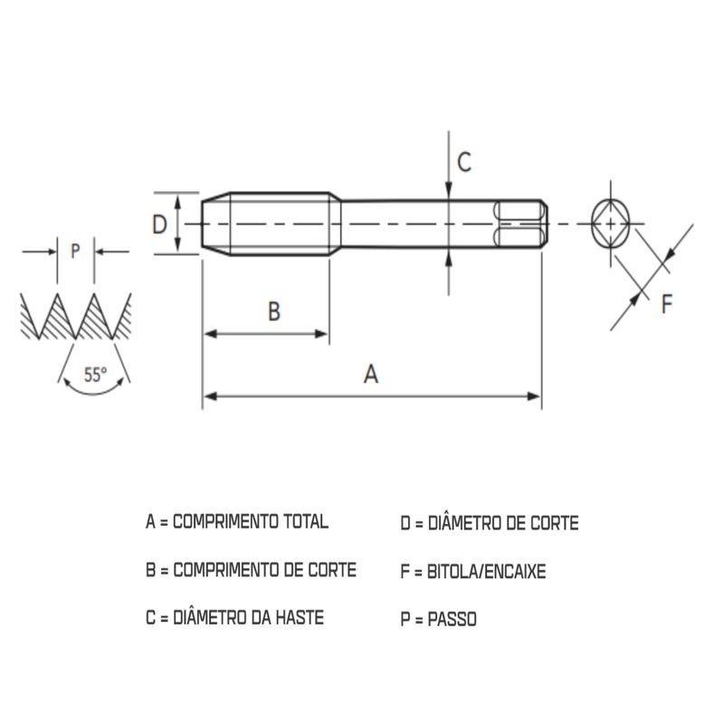 Dimensões: A = 70mm / B = 20mm / C = 12mm / D = 16,66mm / F = 9mm / P = 19 FPP (fios por polegada).