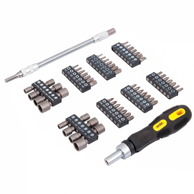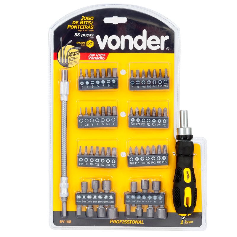 O Jogo de Bits 1/4'' com 58 Peças Vonder é ideal para manutenção de relógios, óculos e componentes eletrônicos.