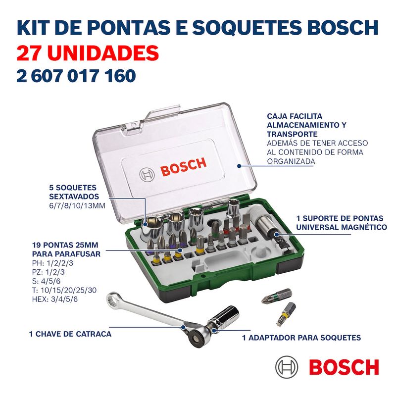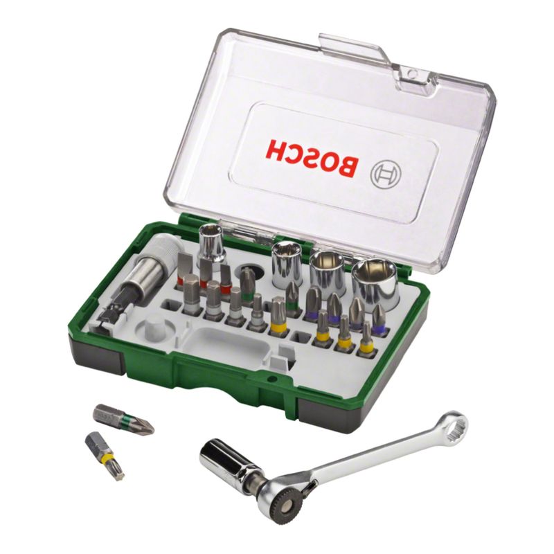 O Jogo de Bits e Soquetes Extra Hard com 27 Peças Bosch é ideal para aplicações universais de parafusamento e fixação.