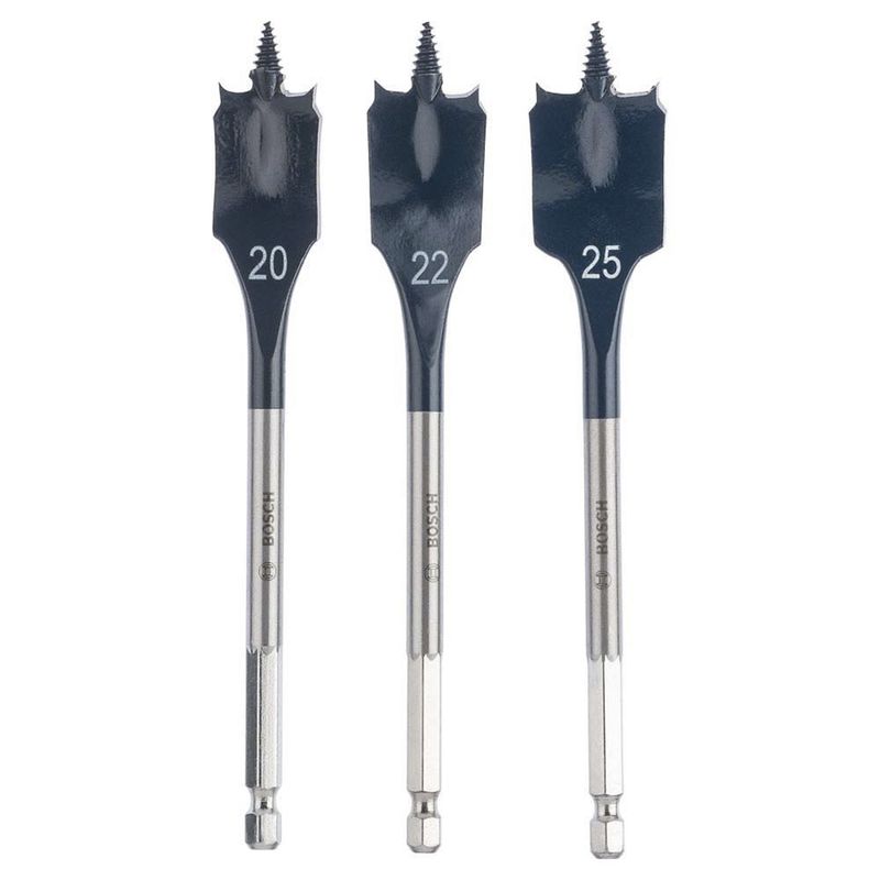 O Jogo de Brocas Chatas para Madeira 20 a 25mm Self Cut Speed com 3 Peças Bosch é ideal para perfuração em madeira, madeira dura, madeira maciça, madeira macia e placas de aglomerado de madeira.