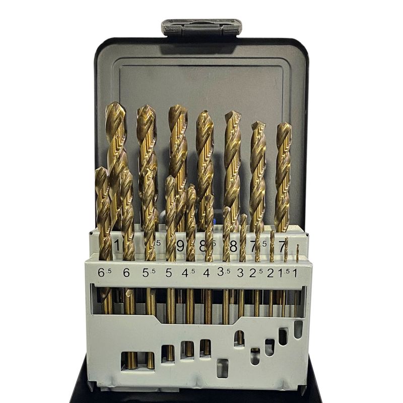 19 Brocas HSS-CO Heller: 1, 1.5, 2, 2.5, 3, 3.5, 4, 4.5, 5, 5.5, 6, 6.5, 7, 7.5, 8, 8.5, 9, 9.5 e 10 mm.