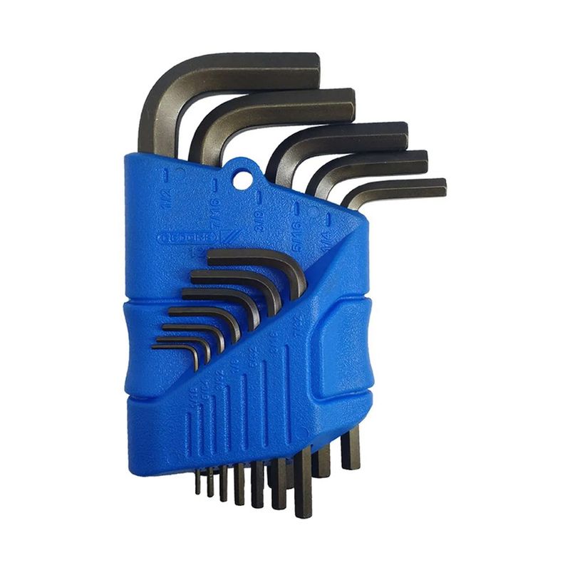 12 Chaves Allen: 1/16”, 5/64”, 3/32”, 1/8”, 5/32”, 3/16”, 7/32”, 1/4”, 5/16”, 3/8”, 7/16'' e 1/2''.