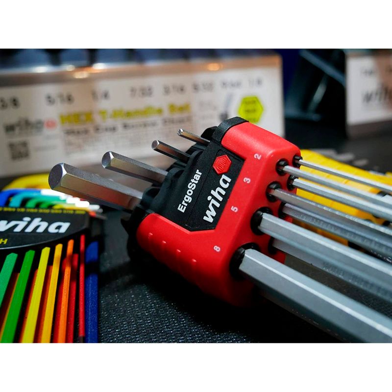 O Jogo de Chaves Allen Abauladas 1.5 a 10mm e 0.05'' a 3/8'' Wiha contém 22 peças ideais para apertar parafusos em locais de acesso limitado ou que exigem mais torque