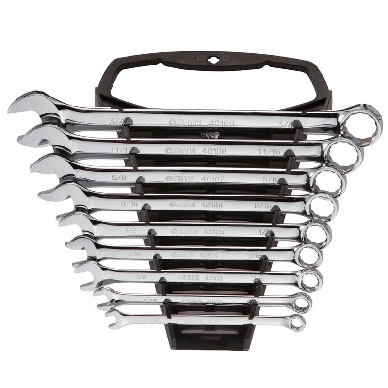 O Jogo de Chaves Combinadas 1/4'' a 3/4'' Sata contém 9 peças ideais para afrouxar e apertar parafusos e porcas sextavadas e quadradas.