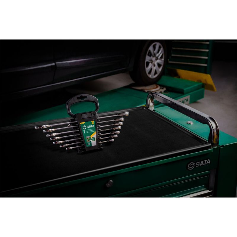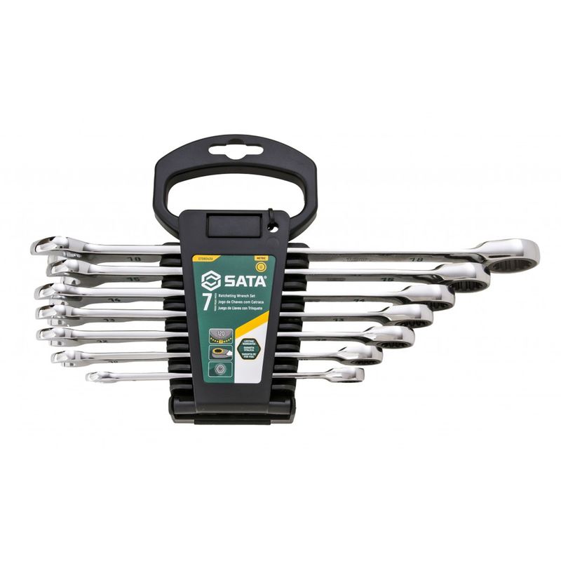O Jogo de Chaves Combinadas com Catraca 120XP 8 a 18mm Sata contém 7 peças ideais para afrouxar e apertar parafusos e porcas sextavadas e quadradas.