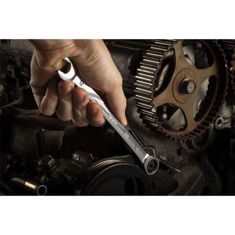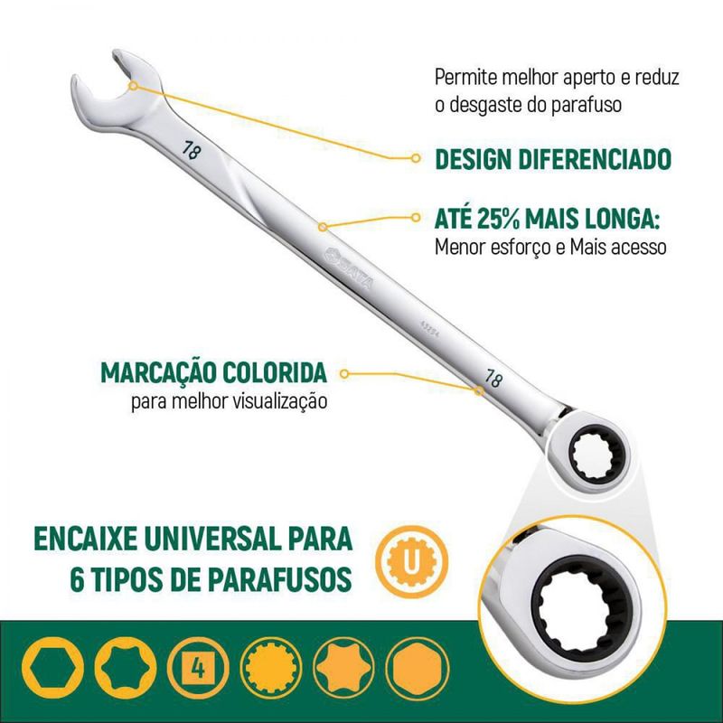 Seu lado estrela possui um mecanismo com catraca que permite realizar trabalhos com mais agilidade e facilidade do que uma chave estrela comum.