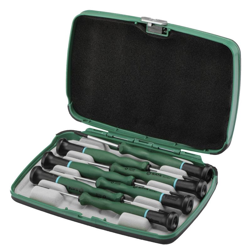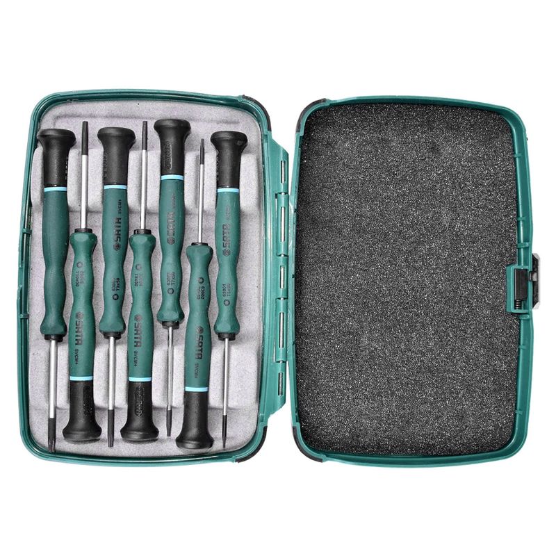 O Jogo de Chaves Torx Retas de Precisão T5 a T15 Sata contém 7 peças muito utilizadas na indústria automobilística, em equipamentos e brinquedos eletrônicos.
