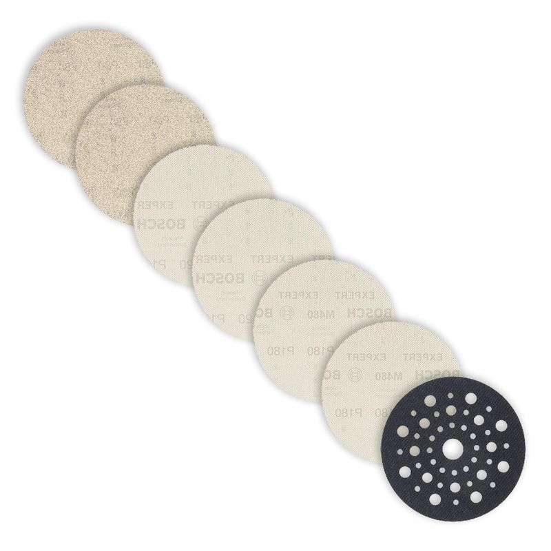 O Kit Disco de Lixa 125mm + Prato de Borracha Bosch contém 7 peças ideais para polimento fino e texturização, praticamente sem pó, em madeira, tinta e drywall.
