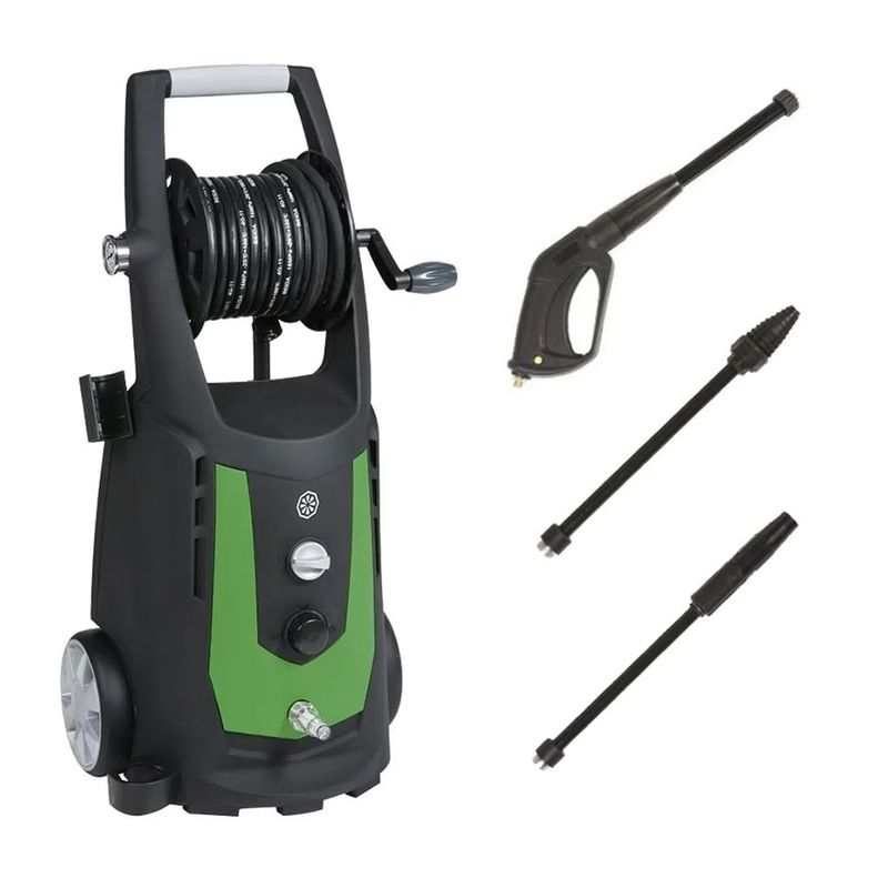 Lavadora de alta pressão monofásica, possui bomba axial com cabeçote em alumínio.