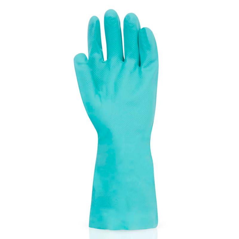 Luva de segurança confeccionada em nitrila, com revestimento interno em flocos de algodão e relevo antiderrapante na face palmar e ponta dos dedos.