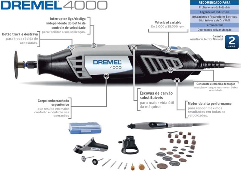 A Micro Retífica 175W 220V 4000-N/26 Dremel é ideal para cortar, furar, gravar, esculpir, lixar, limpar, polir, esmerilhar e afiar madeira, metal, plástico, couro, EVA, papelão, cerâmica, pedra, vidro e fibra de vidro.