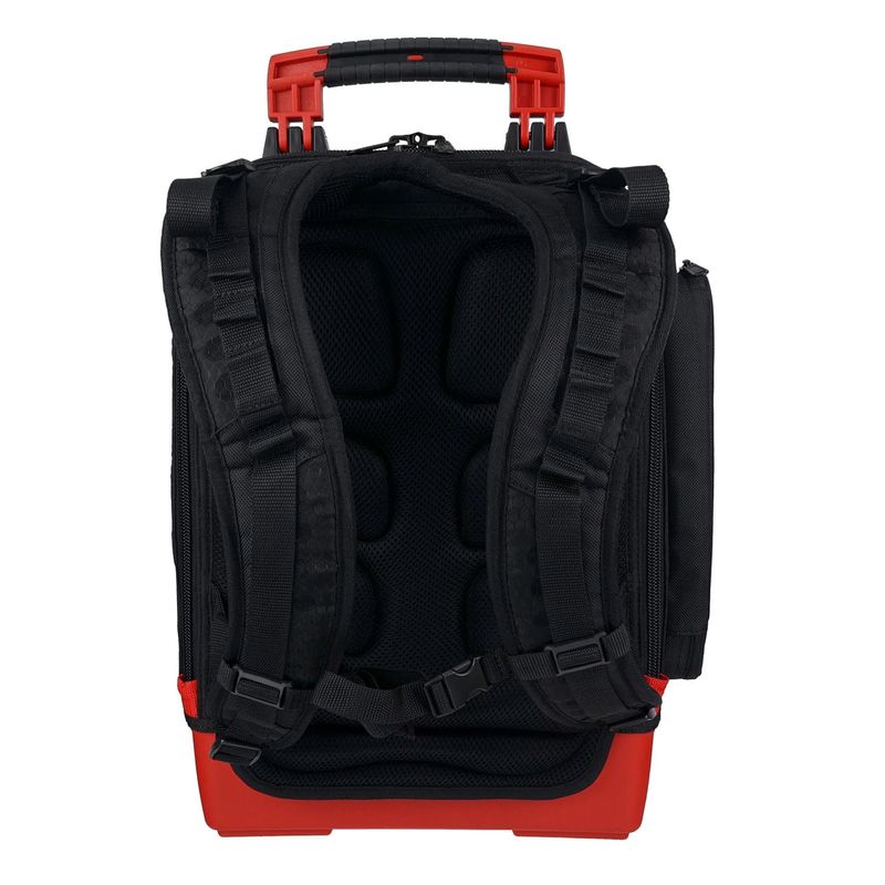 Sua base rígida e impermeável oferece resistência a inclinações, garantindo que as ferramentas permaneçam seguras, secas e estáveis, mesmo quando a mochila está aberta.