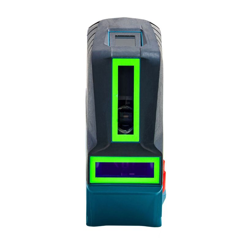 Possui esquadro frontal, onde um cruzamento com ângulos de 90º exatos é projetado na parede como guia para instalação e pontos de prumo que permitem o alinhamento perfeitamente perpendicular entre um ponto projetado no teto e outro no chão sem necessidade de marcações adicionais em parede ou solo.