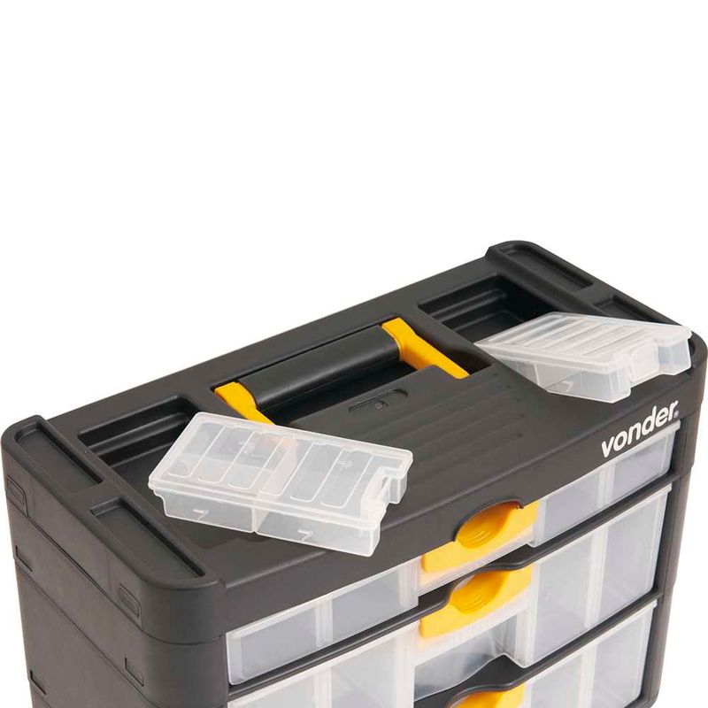 O Organizador Plástico com 3 Gavetas e Compartimentos Externos OPV 0400 Vonder possui capacidade de carga de 9kg.