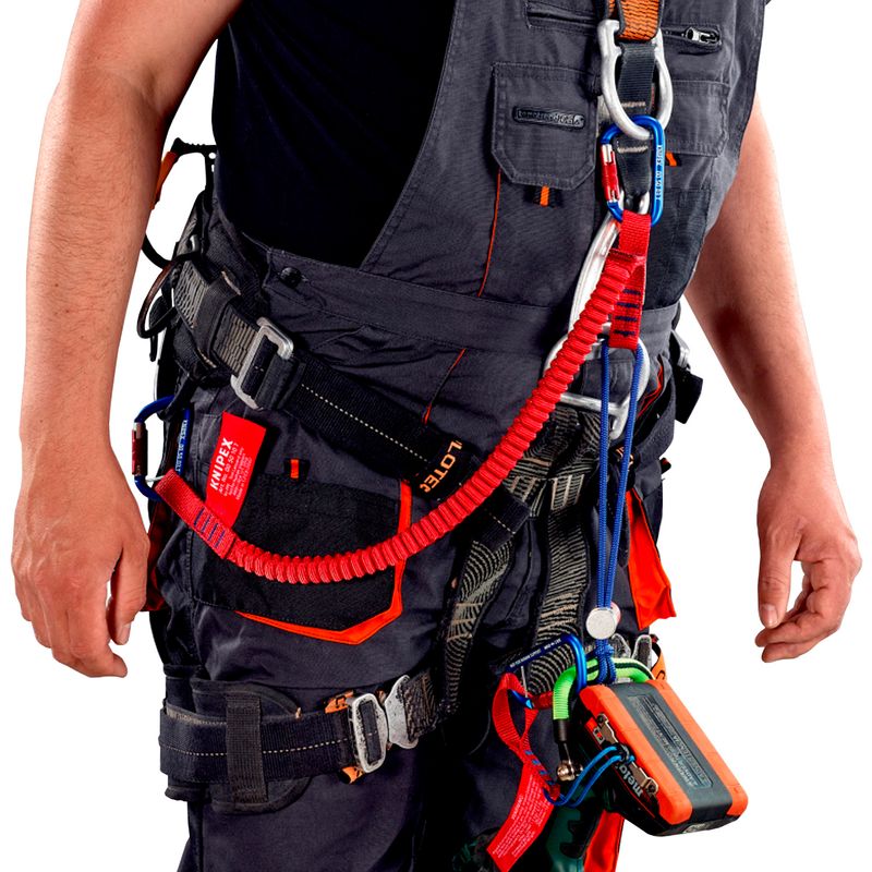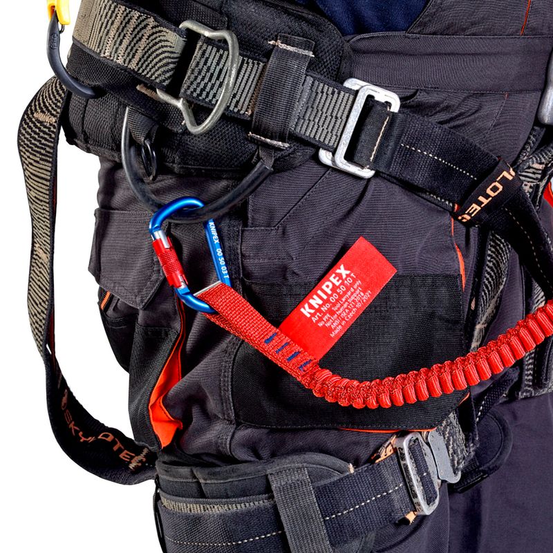 O Safety Cord com Mosquetão Fixo Knipex é ideal para amarrar ferramentas em trabalhos em altura, permitindo um travamento automático e impedindo que as ferramentas caiam.