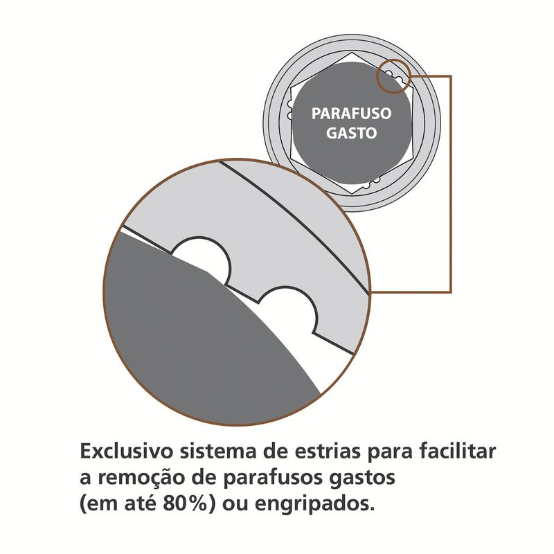 Possui exclusivo sistema de estrias para facilitar a remoção de parafusos gastos (em até 80%) ou engripados.