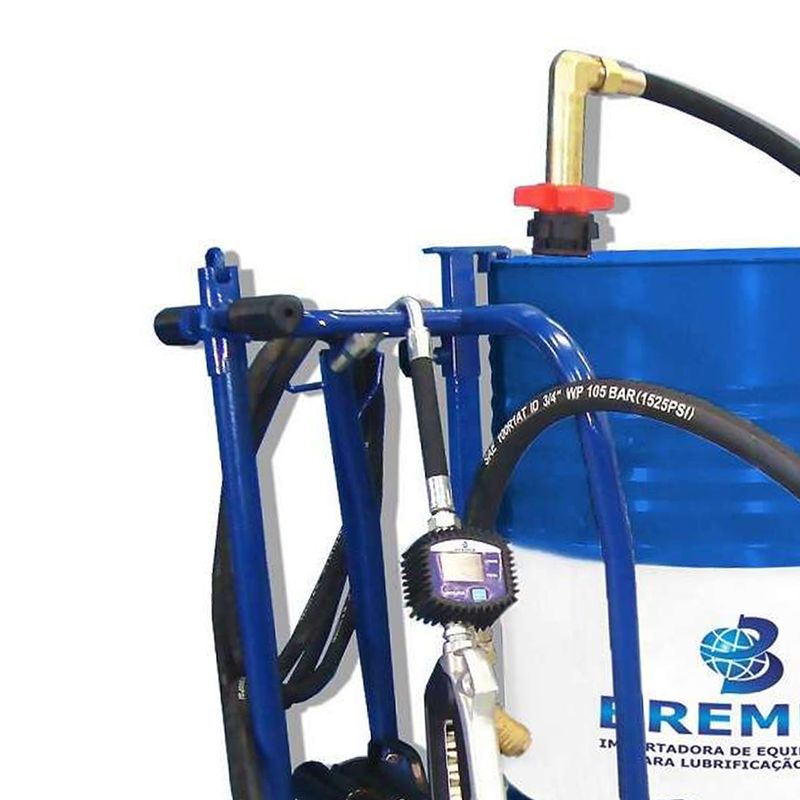 Conta com carrinho para deslocamento do tambor de óleo e medidor de vazão digital para maior controle de quantidade de óleo.